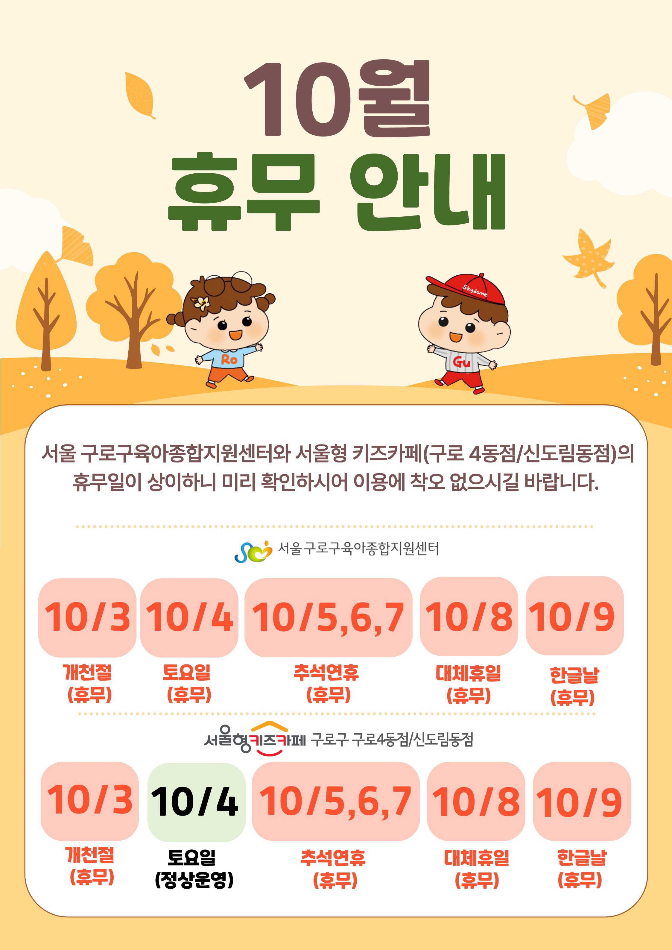 [GUROSCC-안내] 2025년 10월 휴무 안내(구로구육아종합지원센터/서울형 키즈카페)