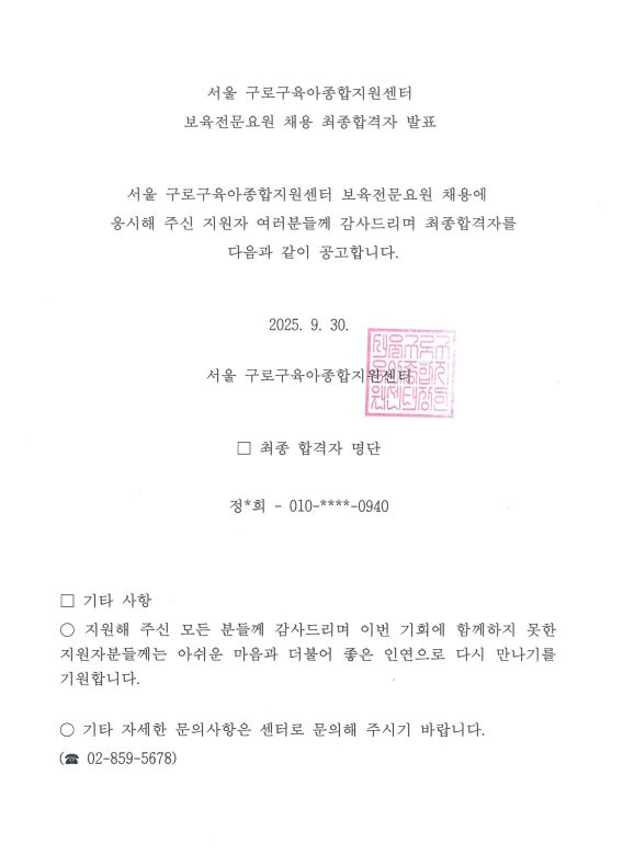 [GUROSCC-채용] 2025년 서울 구로구육아종합지원센터 직원(보육전문요원) 채용 최종 합격자 발표 안내