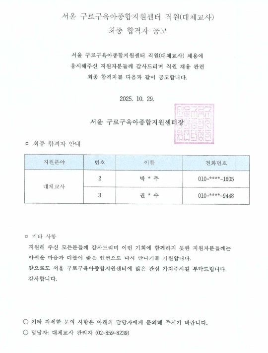 [GUROSCC-채용] 2025년 서울 구로구육아종합지원센터 직원(대체교사) 채용 최종 합격자 발표