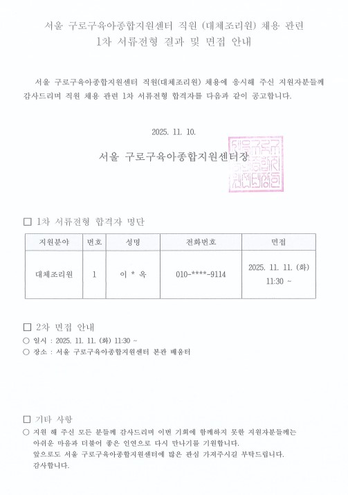 [GUROSCC-채용] 2025년 서울 구로구육아종합지원센터 직원(대체조리원) 채용 관련 1차 서류전형 결과 및 면접 안내