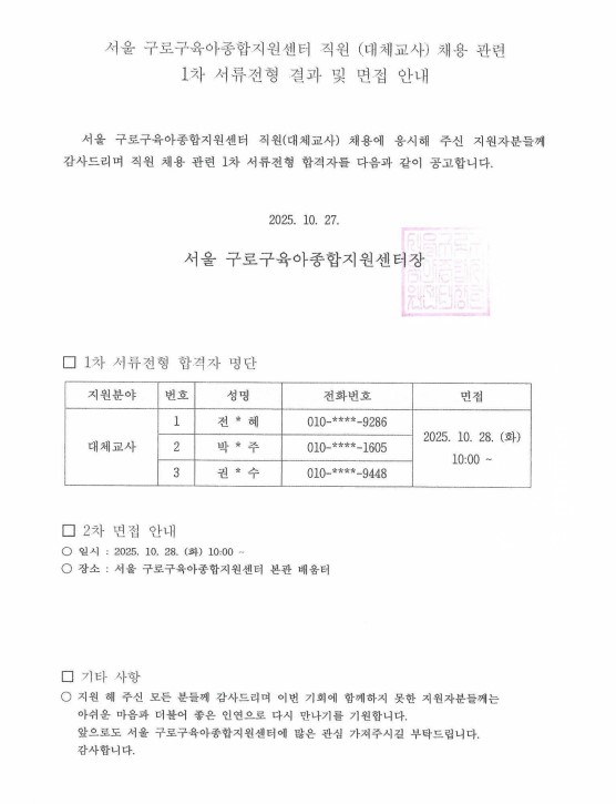 [GUROSCC- 채용] 2025년 서울 구로구육아종합지원센터 직원 (대체교사) 채용 관련 1차 서류전형 결과 및 면접 안내