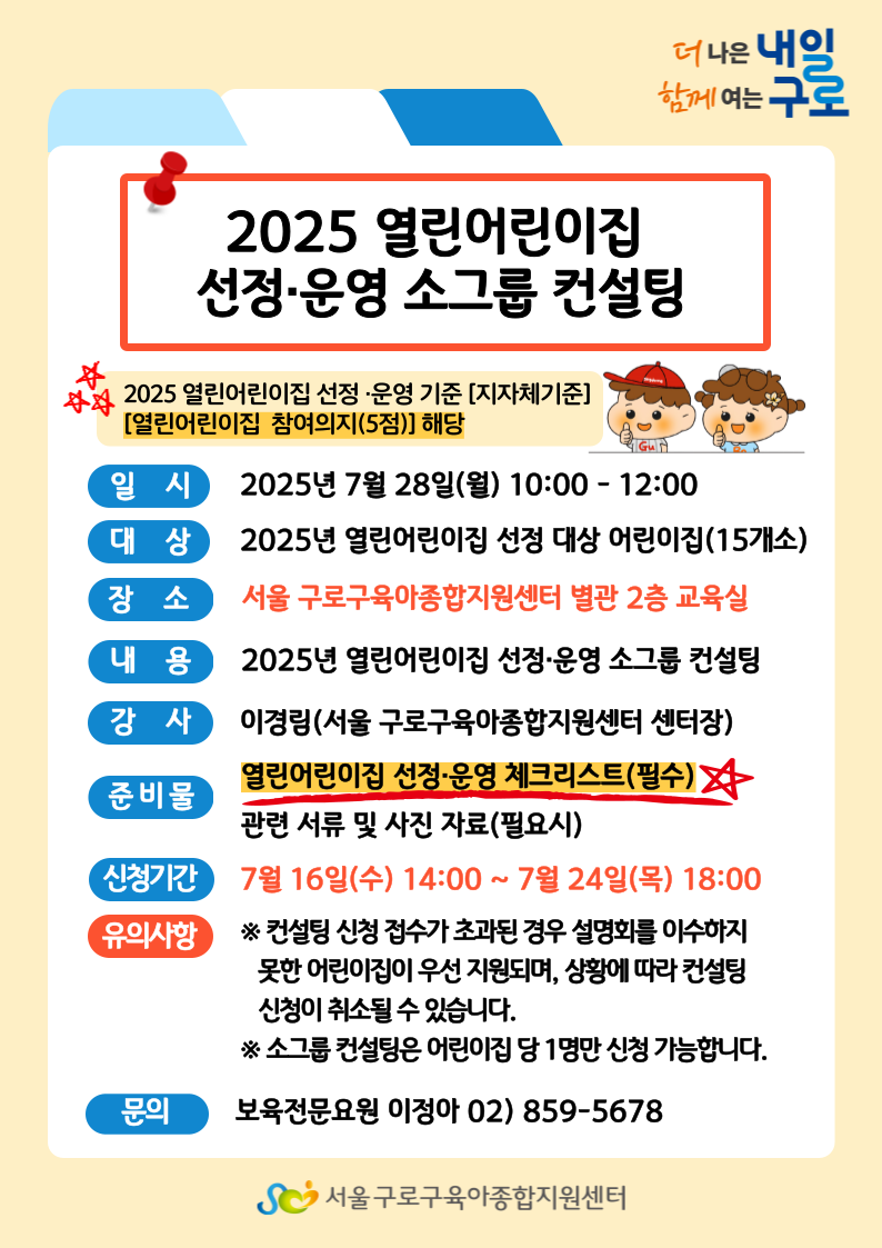 1. 교육 신청 후 7/24(목) 18:00까지 첨부파일에 있는 컨설팅 체크리스트를 작성하신 후 메일 회신 바랍니다. 2. 2025년 열린어린이집을 신청한 어린이집 대상 컨설팅으로, 신청 인원 초과 시 설명회를 미이수한 어린이집이 우선 지원됩니다. |