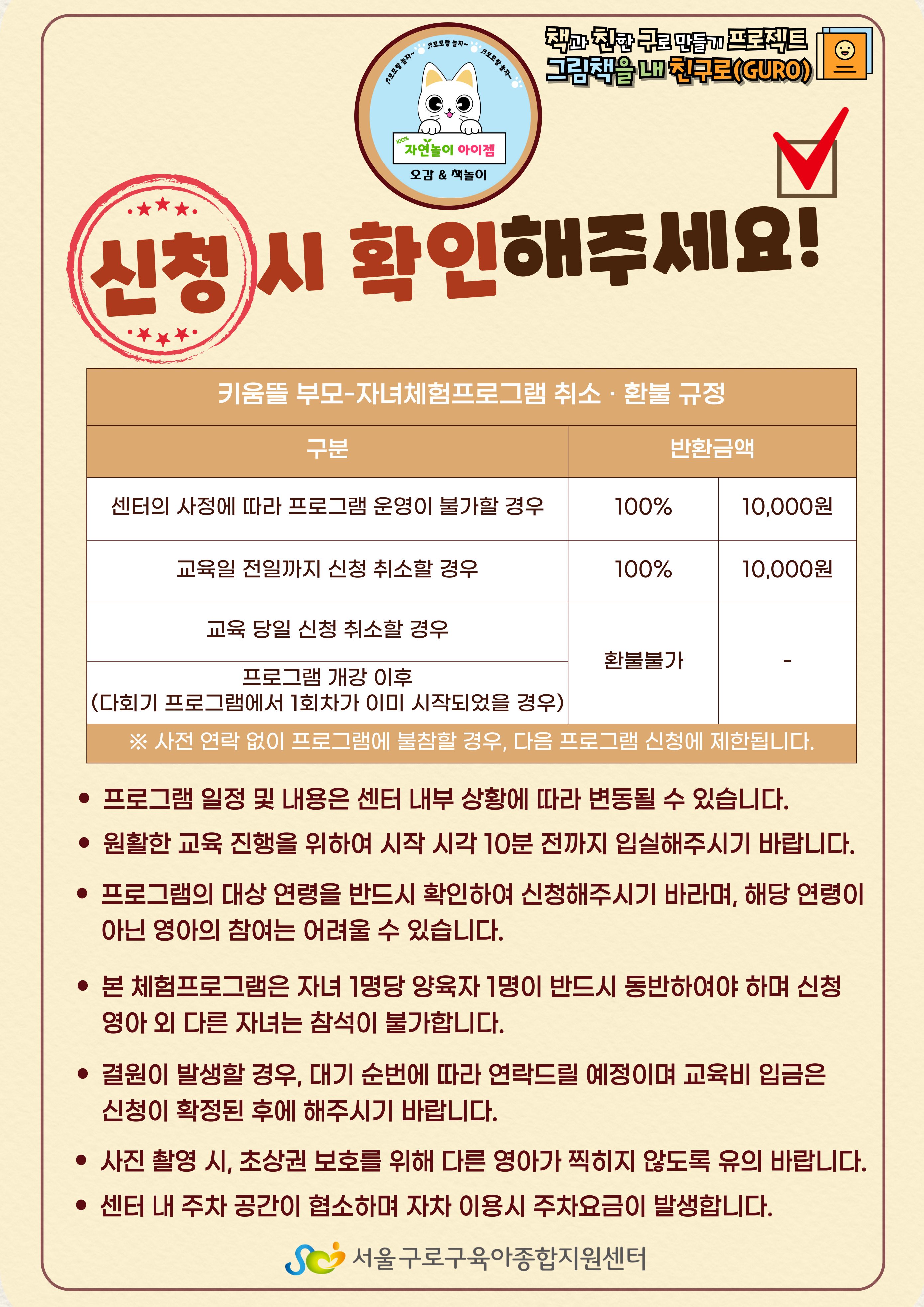 ※두 날짜 모두 참석 가능한 가정만 신청해주시기 바랍니다. ※본 교육은 부모-자녀체험프로그램으로 자녀 1명당 보호자 1명이 동반 참석해주셔야 합니다. (형제아 신청일 경우, 따로 신청해주시기 바랍니다.) ※교육 개월수를 잘 확인하시어 신청해주시기 바랍니다. ※교육비 입금 계좌) 우리은행 1005-304-300210 (예금주: 구로구육아종합지원센터) ※교육비 입금 후 교육을 취소하실 경우, 반드시 센터로 사전 연락해주셔야만 확인이 가능하며 기간 내 환불신청서 제출 시에만 환불이 가능합니다. |